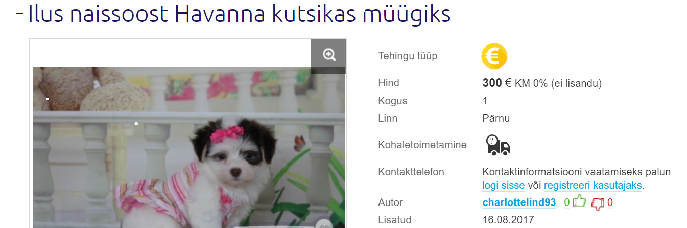 Mitmetes Eesti kuulutusteportaalides on müügil esmapilgul üllatavalt odavad kutsikad: Havanna bichon 300 eurot, kuldne retriiver 200 eurot, Ameerika akita 200 eurot. Kõik kolm on tõukoerad, kelle hindu korralikud aretajad ealeski nii madalale ei laseks ning tõenäoliselt on seetõttu tegu petuskeemiga. Kahtlase sisuga loomamüügikuulutustest on Lemmik varemgi kirjutanud ning pea alati on nende ühiseks osaks ebatavaliselt odavad hinnad, looma asukoht välismaal, läbi Google'i või mõne muu otsingumootori leitud fotod ning segane, mõnest muust keelest otsetõlgitud tekst. Otsustasin härjal sarvist haarata ja ühe sellise kuulutuse omanikuga ise ühendust võtta, et tema müüdava kutsika kohta aru pärida.