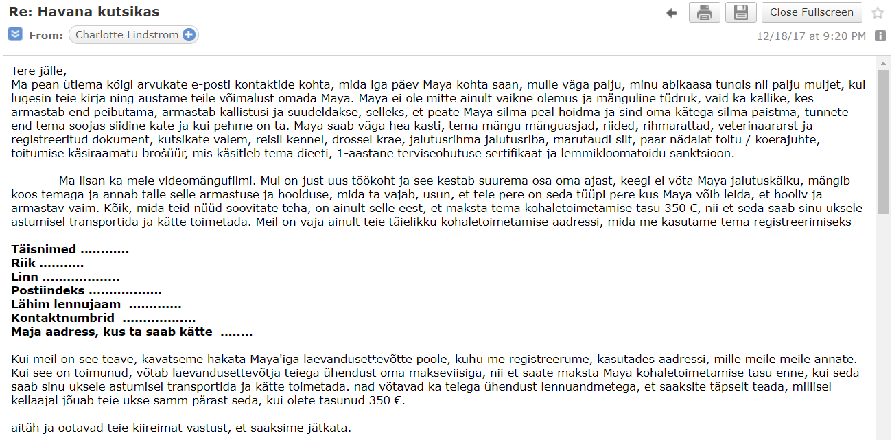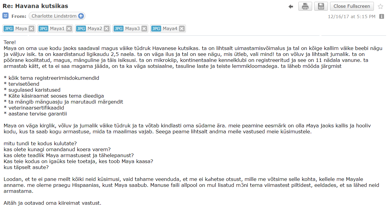 Algus oli lihtne: minu identiteediks sai Tallinnas elav Anna, kes töötab kodust ning endale seetõttu neljajalgset sõpra otsib. Valituks osutus Havanna bichon tõugu kutsikas hinnaga 300 eurot, asukohaga Pärnu ning müüjaks Charlotte Lindström e-mailiga charlottelind93@gmail.com.Esimene e-mail Charlotte'ile sai lühike — uurisin, kas kutsikas on veel saadaval ning kas temast oleks võimalik saada rohkem fotosid. Charlotte'i kiituseks võib öelda, et ta on kiire asjaajaja, sest vastus saabus meeldivalt ruttu. Kirja sisu aga oli mitteüllatavalt halb: arvatavasti inglise keelest tõlgitud tekst kirjeldas kutsikas Mayat kui «isiksusi täis, uimastamisvõimelist ja magusat» koera, kellel on «kõige kallim väike beebi nägu ja väljuv isik».