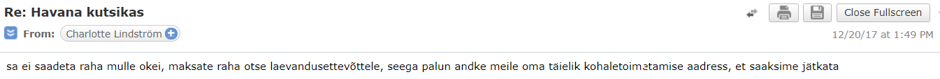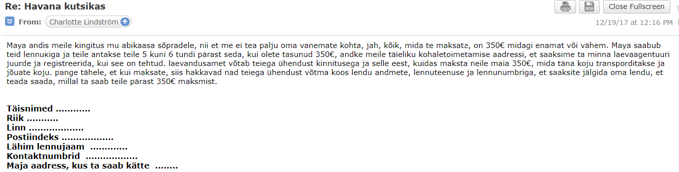 Tekstist võib hea tahtmise korral välja lugeda, et Maya anti Charlotte'i abikaasale kingituseks ning seetõttu ei tea nad tema pesakonnast ja vanematest midagi. Kirja lõppu on jälle lisatud kontaktandmete nimekiri, mille ma ära täitma peaks ning video kohta ei ole jätkuvalt ei kippu ega kõppu. Veel enne, kui jõuan kirjale vastata, on Charlotte uuesti kirjutanud ja tuletanud mulle meelde, et ootab mu vastust, enne kui asjaajamisega jätkab. Kirjutan konkreetselt, et tahan enne talle raha saatmist koerast videot ning küsin veel viisakalt, et kas see on ikka võimalik.